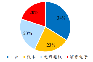根据Yole数据,2017年全球功率半导体市场规模为327亿美元,预计到2022年达到426亿美元,复合增长率为5.43%。其中,工业、汽车、无线通讯和消费电子是功率半导体的前四大终端市场。根据中商产业研究院的数据,2017年工业应用市场占全球功率半导体市场的34%,汽车领域占比为23%,消费电子占比为20%,无线通讯占比为23%。随着对节能减排的需求日益迫切,功率半导体的应用领域从传统的工业领域和4C领域逐步进入新能源、智能电网、轨道交通、变频家电等市场。
