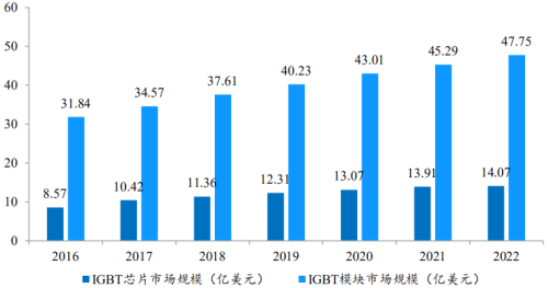 IGBT分为IGBT芯片和IGBT模块,IGBT模块常用于大电流和大电压环境。预计2022年全球IGBT芯片市场规模为14.07亿美元,IGBT模块市场规模为47.75亿美元。