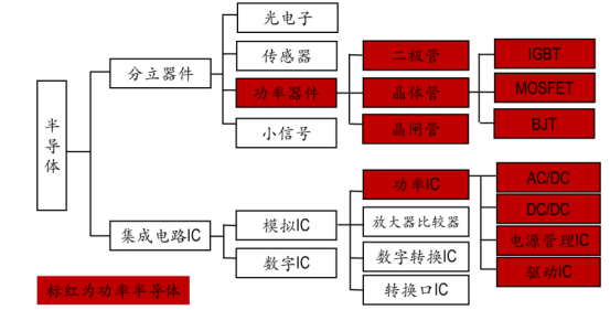 功率半导体主要分为功率器件、功率IC。其中功率器件主要包括二极管、晶体管、晶闸管三大类别,其中晶体管是分立器件中市场份额最大的种类。常见晶体管主要有BJT、IGBT和MOSFET。