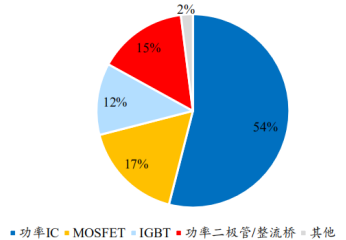 根据Yole数据,2017年功率IC占全球功率半导体市场规模的54%,是市场份额占比最大的功率半导体产品;MOSFET市场规模占比17%;功率二极管市场规模占比15%;由于IGBT的操作频率范围较广,能够覆盖较高的功率范围,市场规模占比12%。