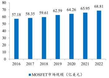 MOSFET(金属-氧化物半导体场效应晶体管):可广泛运用于数字电路和模拟电路,运用于开关电源、镇流器、高频感应加热等领域。MOSFET在功率器件中占比最高,2018年全球MOSFET市场规模为59.61亿美元,占功率器件市场的39.78%。预计2020年全球市场规模可达68.81亿美元。
