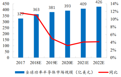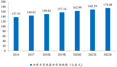 受益于工业、电网、新能源汽车和消费电子领域新兴应用不断出现,功率半导体器件市场规模不断增长。根据Yole数据,2017年全球功率半导体器件市场规模为144.01亿美元,预计到2022年功率半导体器件市场规模将达到174.88亿美元,复合增长率为3.96%。