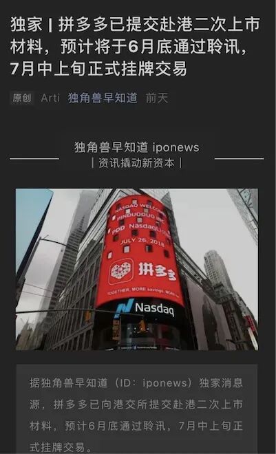 6月5日一大早,证券分析师李晓又看到了拼多多“二次香港上市”的消息。这条消息发布于一家名为“独角兽早知道”的自媒体。