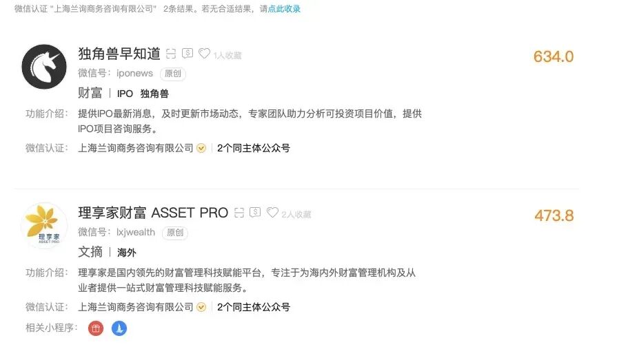 工商资料信息显示,“独角兽早知道”是一个提供IPO最新消息、并提供IPO项目咨询服务的公众号,其运营主体为“上海兰询商务咨询有限公司”,与“理享家财富asset pro”同属一个运营主体。
