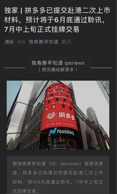 6月5日一早,自媒体“独角兽早知道”发布“独家新闻”称:拼多多已经港交所提交赴港上市材料,预计6月底通过聆讯,7月中上旬正式挂牌。
