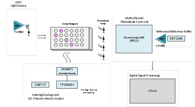 当扩增发生时,针对病原体标签序列的荧光标签会被光源激发;单个光电二极管或一组光电二极管能够检测到荧光。信号水平会随着扩增时间或周期而变化,从而指示样本中特定病原体的初始浓度。在扩增过程的早期阶段,仅用样本中的几个目标DNA片段就可以检测出这种信号水平,进一步缩短了获得阳性结果(鉴定出目标基因组物质)所需的时间。DDC112系列器件可以对1到256个二极管的电流进行采样,并将电流放大器和ADC集成到一个电路中。这些器件具有非常低的输入参考噪声(在均方根铁磁安培范围内)、低输入偏置电流(0.1 pA)以及具有高达24位分辨率的高线性度ADC。