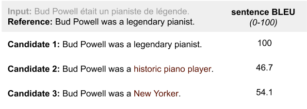 相较于人工质量评估,采用自动化指标的方法成本更低、效率更高。自动化指标通常会将参评语句和参考语句同时输入系统,然后根据词汇重叠情况进行评分,以表明前者与后者的相似程度。其中一个热门指标就是 BLEU,该指标可统计词汇序列同时出现在参评语句和参考语句中的次数(BLEU 得分与精度非常相似)。