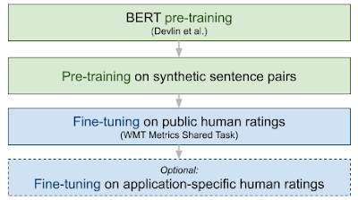 我们对 BLEURT 进行了两次预训练,第一次使用的是语言模型目标(如 原 BERT 论文中所述),第二次使用的是 NLG 评估目标集合。然后,我们根据 WMT 指标数据集和/或用户提供的评分集合对模型精选了微调。下图举例说明了 BLEURT 的端到端训练流程。