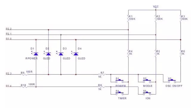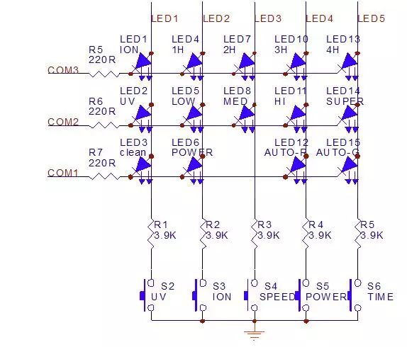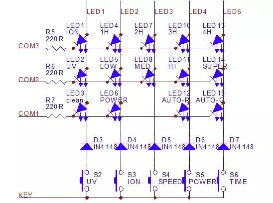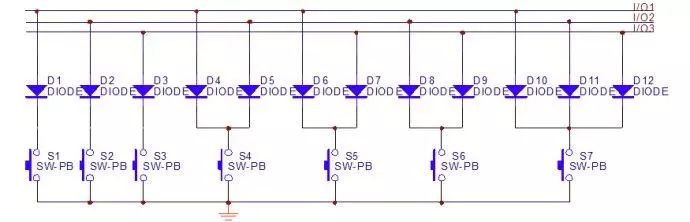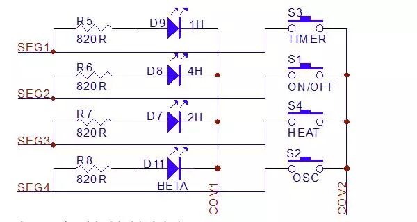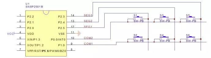 电路中扫描口都得为双向的I/O口,如此电路是用电池供电需要省电功能(让ic进睡眠模式),则将COM1、COM2或SEG口用到具有唤醒功能的I/O口即可。