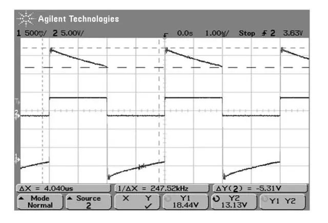 这种感应型按键的实现原理是基于电容对高频脉冲信号的耦合特性,通常称该电容为耦合电容。当该耦合电容的容值发生改变时,经过该电容耦合得到的高频脉冲的高电平幅值将发生改变。如图所示: