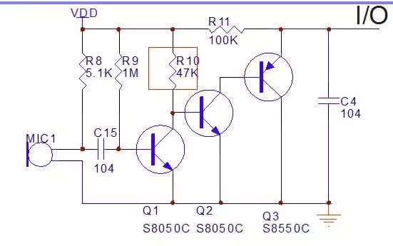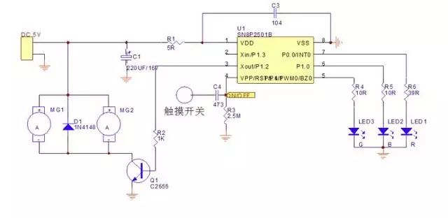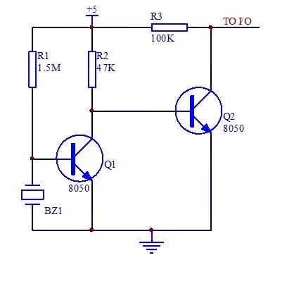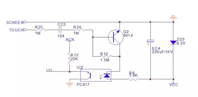 直接采用人体感应电压去改变输入检测口的电平做按键检测,此电路稳定性比较差,但成本低,图中的触摸开关为一导体。
