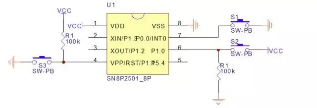 图中S1、S2、S3为常用的三种按键,其中S3接在U1第4脚为低电平触发脚有效,因为U1第4脚内部没有上拉电阻,所以得在U1第4脚外面接一上拉电阻以确保在不按下按键时让U1第4脚维持在高电平状态,采用S2接法时,为高电平触发有效,因这颗IC内部没有下拉电阻,所以得在U1第4脚外面接一下拉电阻以确保在不按下按键时让U1第4脚维持在低电平状态,S1因Ic内部有上拉电阻,则不要外加器件。