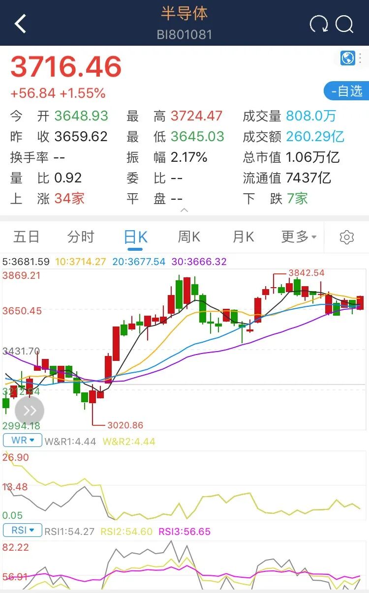 海通半导体(BI801081)指数今日(6月18日)收盘指数为3716.46,涨幅为1.55%,总成交额达260.29亿。其中上涨34家,下跌7家。