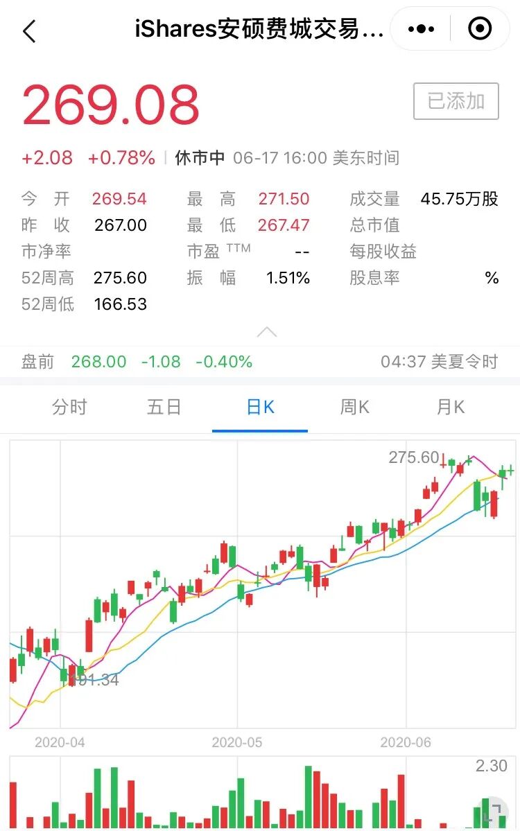 腾讯自选股数据显示,6月17日美股半导体指数ETF(SOXX.US)收盘价格为269.08美元,涨幅为0.78%,总成交量达45.75万股。