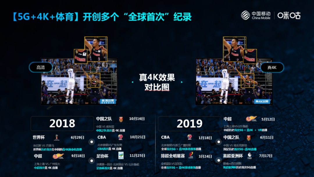 截至2020年4月,咪咕在体育领域已经有22次"全球首场"级的真4K直播;文娱领域共计有22次5G+真4K直播。