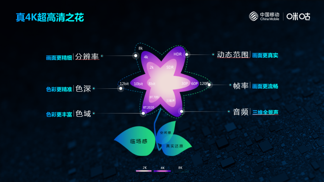 在这方面,中国移动咪咕一直以真4K为标准推动旗下视频平台咪咕视频的超高清技术研发与内容制作。咪咕有一个"真4K超高清之花"示意图,比较直观,可以参考: