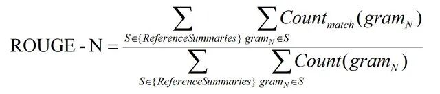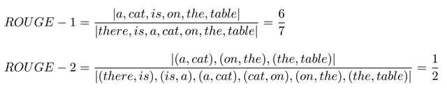 针对上面的例子  p1 = 1/5   (因为there在C和S1中都出现了 我们按最少的次数来) 惩罚因子 上面介绍了 BLEU 计算 n-gram 精确率的方法, 但是仍然存在一些问题,当机器翻译的长度比较短时,BLEU 得分也会比较高,但是这个翻译是会损失很多信息的,例如: C: a cat 优点 它的易于计算且速度快,特别是与人工翻译模型的输出对比; 它应用范围广泛,这可以让你很轻松将模型与相同任务的基准作对比。 缺点 不能很好地处理形态丰富的语句(BLEU原文建议大家配备4条翻译参考译文) BLEU 指标偏向于较短的翻译结果(brevity penalty 没有想象中那么强) 2)ROUGE 英文全称Recall-Oriented Understudy for Gisting Evaluation,可以看做是BLEU 的改进版,专注于召回率而非精度 。换句话说,它会查看有多少个参考译句中的 n 元词组出现在了输出之中。 ROUGE-N (将BLEU的精确率优化为召回率) ROUGE-L (将BLEU的n-gram优化为公共子序列) ROUGE-W (将ROUGE-L的连续匹配给予更高的奖励) ROUGE-S  (允许n-gram出现跳词(skip)) ROUGE 用作机器翻译评价指标的初衷是这样的:在 SMT (统计机器翻译)时代,机器翻译效果稀烂,需要同时评价翻译的准确度和流畅度;等到 NMT (神经网络 机器翻译)出来以后,神经网络脑补能力极强,翻译出的结果都是通顺的,但是有时候容易瞎翻译。 ROUGE的出现很大程度上是为了解决NMT的漏翻问题(低召回率)。所以 ROUGE 只适合评价 NMT,而不适用于 SMT ,因为它不管候选译文流不流畅 ROUGE-N “N”指的是N-gram,其计算方式与BLEU类似,只是BLEU基于精确率,而ROUGE基于召回率。 ROUGE-N 主要统计 N-gram 上的召回率,对于 N-gram,可以计算得到 ROUGE-N 分数,计算公式如下: