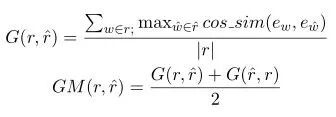 得到了若干个三元组之后,我们通过下面的公式来计算候选句c和参考句(或集合)S的得分:  好处 和基于n-gram的评价模式相比,有更高的和人类评价的相关性 缺点 依赖于semantic parsers , 但是他不总是对的 每个目标,属性,关系的权重都是一样的(一幅画的物体显然有主次之分) 上面的词重叠评价指标基本上都是n-gram方式,去计算生成响应和真是响应之间的重合程度,共现程度等指标。而词向量则是通过Word2Vec、Sent2Vec等方法将句子转换为向量表示,这样一个句子就被映射到一个低维空间,句向量在一定程度上表征了其含义,在通过余弦相似度等方法就可以计算两个句子之间的相似程度。 使用词向量的好处是,可以一定程度上增加答案的多样性,因为这里大多采用词语相似度进行表征,相比词重叠中要求出现完全相同的词语,限制降低了很多。 不过说句实话,至少在我读过的paper里很少有人用(或者说只用)这种评价指标来衡量模型好坏的。作为知识拓展,这里也简单介绍一下。 1、Greedy Matching