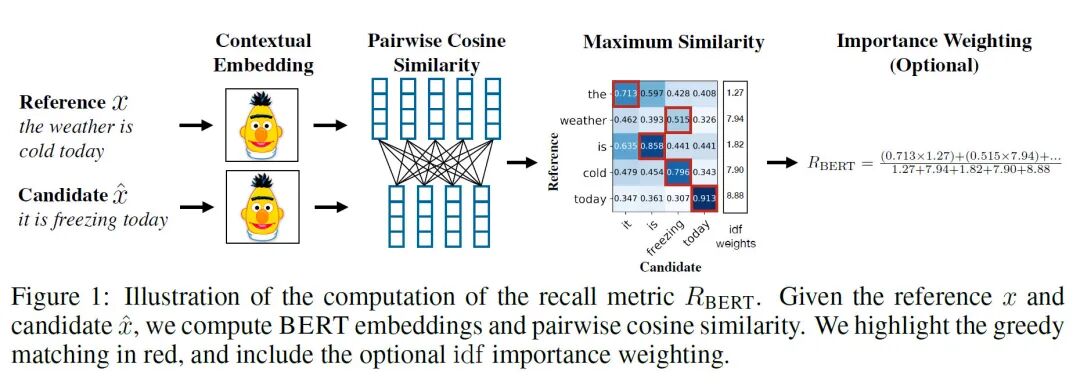 跟上面的方法类似,也是先通过词向量计算出句向量,在使用句向量之间的余弦相似度表示二者的相似度。不过句向量的计算方法略有不同,这里采用向量极值法进行计算。 1、PPL 它也可以用来比较两个语言模型在预测样本上的优劣。低困惑度 的概率分布模型或概率模型能更好地预测样本。(例如,给定一段人写的文本,分别查看rnn和gpt-2的ppl分数如何) 注意,PPL指标是越低 ,代表语言模型的建模 能力就越好 。 给测试 集的句子赋予较高概率值的语言模型较好,当语言模型训练完之后,测试集中的句子都是正常的句子,那么训练好的模型就是在测试集上的概率越高越好,公式如下:(滑动查看完整公式)  所以当我们使用tf.contrib.seq2seq.sequence_loss()函数计算模型loss的时候,perplexity的计算就显得很简单了,直接对计算出来的loss取个指数就行了,命令如下所示: train_perp = math .exp(float(mean_loss)) if mean_loss < 300else math.inf 基于N-gram重叠的度量标准只对词汇变化敏感,不能识别句子语义或语法的变化。因此,它们被反复证明与人工评估差距较大。 近年来Bert为代表的的plm红红火火,于是有人提出使用句子上下文表示(bert全家桶)和人工设计 的计算逻辑对句子相似度进行计算。这样的评价指标鲁棒性较好,在缺乏训练数据的情况下也具有较好表现。 BERTSCORE BERTSCORE: EVALUATING TEXT GENERATION WITH BERT , ICLR 2020