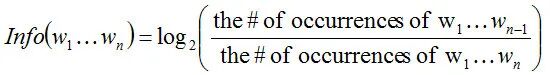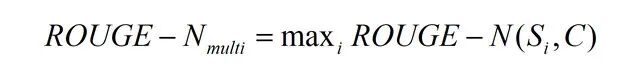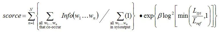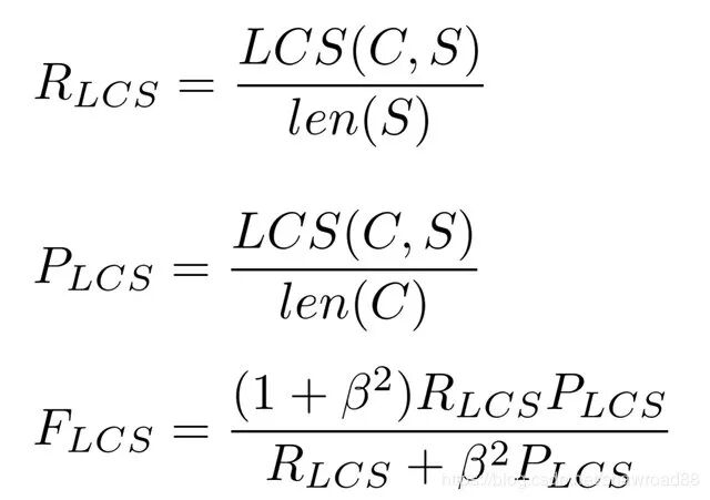 如果给定多个参考译文 Si,Chin-Yew Lin 也给出了一种计算方法,假设有 M 个译文 S1, ..., SM。ROUGE-N 会分别计算机器译文和这些参考译文的 ROUGE-N 分数,并取其最大值,公式如下。这个方法也可以用于 ROUGE-L,ROUGE-W 和 ROUGE-S。 ROUGE-L ROUGE-L 中的 L 指最长公共子序列 (longest common subsequence, LCS),ROUGE-L 计算的时候使用了机器译文C和参考译文S的最长公共子序列,计算公式如下: 公式中的 RLCS 表示召回率,而 PLCS 表示精确率,FLCS 就是 ROUGE-L。一般 beta 会设置为很大的数,因此 FLCS 几乎只考虑了 RLCS (即召回率)。注意这里 beta 大,则 F 会更加关注 R,而不是 P,可以看下面的公式。如果 beta 很大,则 PLCS 那一项可以忽略不计。 ROUGE-W ROUGE-W 是 ROUGE-L 的改进版,考虑下面的例子,X表示参考译文,而Y1,Y2表示两种机器译文。 在这个例子中,明显 Y1的翻译质量更高,因为 Y1 有更多连续匹配的翻译。但是采用 ROUGE-L 计算得到的分数确实一样的,即 ROUGE-L(X, Y1)=ROUGE-L(X, Y2)。  因此作者提出了一种加权最长公共子序列方法 (WLCS),给连续翻译正确的更高的分数,具体做法可以阅读原论文《ROUGE: A Package for Automatic Evaluation of Summaries》 ROUGE-S ROUGE-S 也是对 N-gram 进行统计,但是其采用的 N-gram 允许"跳词 (Skip)",即跳跃二元组(skip bigram)。例如句子 "I have a cat" 的 Skip 2-gram 包括 (I, have),(I, a),(I, cat),(have, a),(have, cat),(a, cat)。 跳跃二元组是句子中有序的单词对,和LCS类似,在单词对之间,单词可能被跳过。比如一句有4个单词的句子,按照排列组合就可能有6种跳跃二元组。 再次使用精度和召回率来计算F,将句子Sij中跳跃二元组的个数记为 3)NIST NIST(National Institute of standards and Technology)方法是在BLEU方法上的一种改进。 最主要的是引入了每个n-gram的信息量(information)  的概念。BLEU算法 只是单纯的将n-gram的数目加起来,而nist是在得到信息量累加起来再除以整个译文的n-gram片段数目。这样相当于对于一些出现少的重点的词权重就给的大了。  解释一下:分母是n元词在参考译文中出现的次数,分子是对应的n-1元词在参考译文中的出现次数。对于一元词汇,分子的取值就是整个参考译文的长度。这里之所以这样算,应该是考虑到出现次数少的就是重点词这样的一个思路。 计算信息量之后,就可以对每一个共现n元词乘以它的信息量权重,再进行加权求平均得出最后的评分结果: