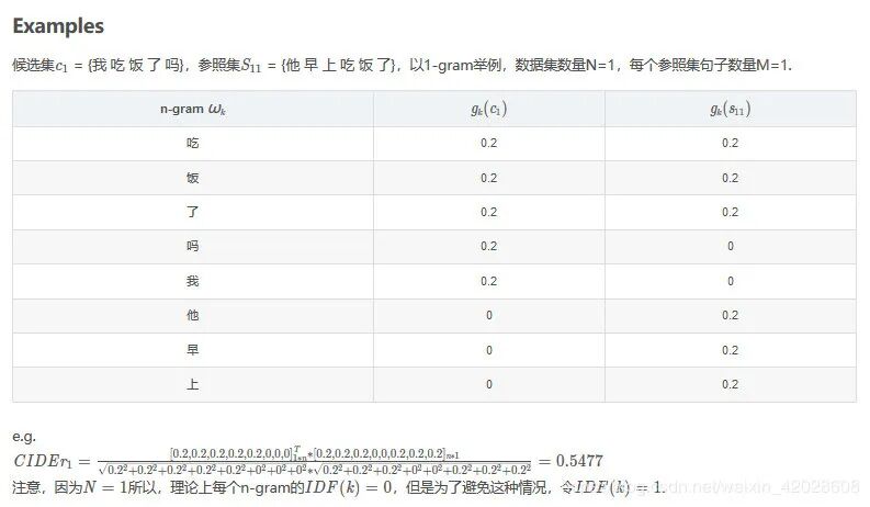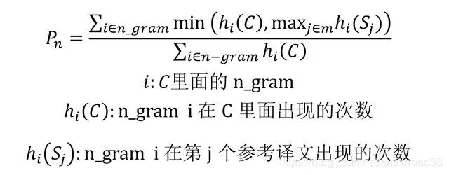 BLEU 需要计算译文 1-gram,2-gram,...,N-gram 的精确率,一般 N 设置为 4 即可,公式中的 Pn 指 n-gram 的精确率。 Wn 指 n-gram 的权重,一般设为均匀权重,即对于任意 n 都有 Wn = 1/N。 BP 是惩罚因子,如果译文的长度小于最短的参考译文,则 BP 小于 1。 BLEU 的 1-gram 精确率表示译文忠于原文的程度,而其他 n-gram 表示翻译的流畅程度。 不过BLEU对词重复和短句有着非常不好的表现,所以改进的BLEU分别使用 改进的多元精度(n-gram precision)  和短句惩罚因子 进行了优化。 改进的多元精度(n-gram precision) C: a cat is on the table 则可以计算出 1-gram,2-gram,... 的精确率(参考文献里写的是准确率(accuracy),我理解是写错了,此处应该是精确率(precision)) p1  计算 a cat is on the table 分别都在参考翻译S1中 所以 p1 = 1 p2   (a, cat)在, (cat is) 没在,  (is on) 没在, (on the) 在, (the table)在  所以p2 = 3/5 p3   (a cat is)不在,  (cat is on)不在, (is on the)不在, (on the table)在  所以 p3 = 1/4 依次类推(上面的在或者不在, 说的都是当前词组有没有在参考翻译中)。直接这样算, 会存在很大的问题. 例如: C: there there there there there S1: there is a cat on the table 这时候机器翻译的结果明显是不正确的,但是其 1-gram 的 Precision 为1,因此 BLEU 一般会使用修正的方法。给定参考译文S1,S2, ...,Sm,可以计算C里面 n 元组的 Precision,计算公式如下: