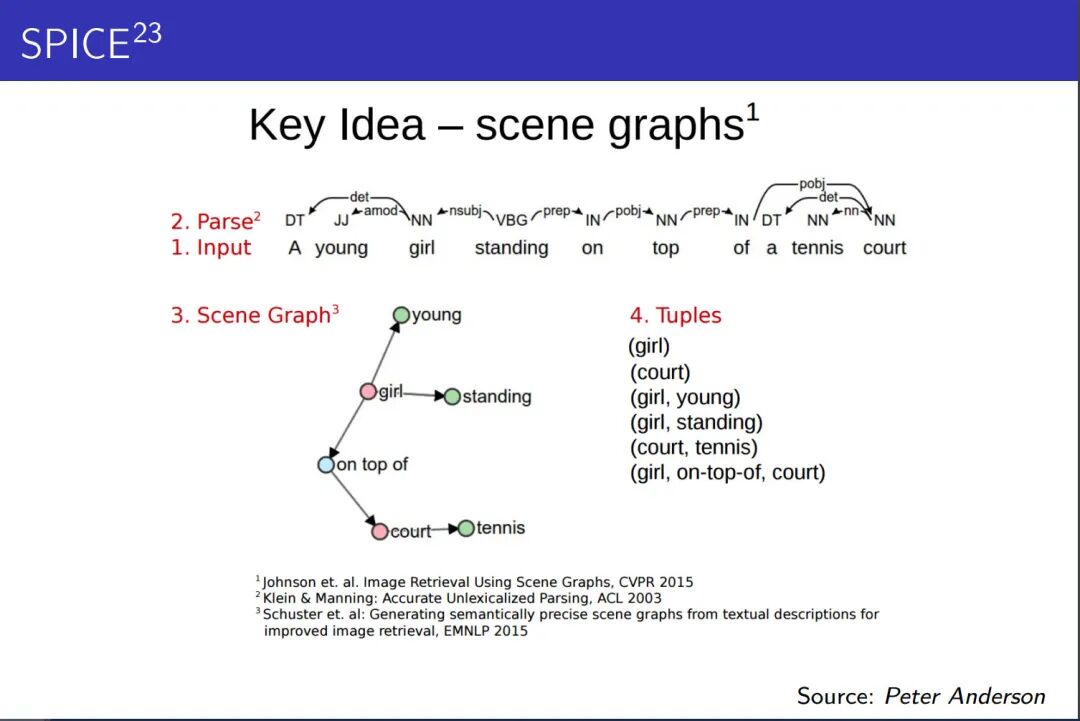 Count(unique ngram)表示回复中不重复的ngram数量,Count(word)表示回复中ngram词语的总数量。 1)CIDEr CIDEr 是专门设计 出来用于图像标注问题的。这个指标将每个句子都看作“文档”,将其表示成 Term Frequency Inverse Document Frequency(tf-idf)向量的形式,通过对每个n元组进行(TF-IDF) 权重计算,计算参考 caption 与模型生成的 caption 的余弦相似度,来衡量图像标注的一致性的。 好处 是一种加权的评价指标,他更关注你是否说到了重点,而常见的词权重则没有那么高。在 Kaustav_slides image caption的综述里,也提到这个评价指标和人类的评价相关性更高一些。 2)SPICE  SPICE  也是专门设计 出来用于 image caption 问题的。全称是 Semantic Propositional Image Caption Evaluation。你很快会发现尽管生成的句子与参考句极为相似(只有basketball一词不一样),但我们仍认为这是一个糟糕的生成。原因在于考虑了语义的情况下,模型把网球场错误的识别成了篮球场。这个时候BLEU或者其他指标就不能很好的评价生成效果了。 SPICE  使用基于图的语义表示来编码 caption 中的 objects, attributes 和 relationships。它先将待评价 caption 和参考 captions 用 Probabilistic Context-Free Grammar (PCFG) dependency parser parse 成 syntactic dependencies trees,然后用基于规则的方法把 dependency tree 映射成 scene graphs。最后计算待评价的 caption 中 objects, attributes 和 relationships 的 F-score 值。还是已上图为例,a young girl standing on top of a tennis court (参考句) 可以被SPICE 做如下处理: