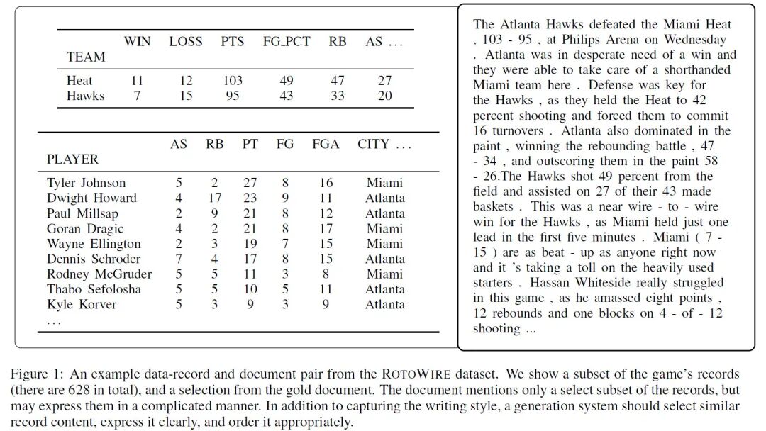 所谓平面图 ,就是1元组之间的映射集。平面图有如下的一些限制:在待评价翻译中的每个1元组必须映射到参考翻译中的1个或0个一元组,然后根据这个定义创建平面图。如果有两个平面图的映射数量相同,那么选择映射交叉数目较少的那个。  也就是说,上面左侧平面图会被选择。状态会持续运行,在每个状态下只会向平面图加入那些在前一个状态中尚未匹配的1元组。一旦最终的平面图计算完毕,就开始计算METEOR得分: 其中m是在参考句子中同样存在的,待评价句子中的一元组的数量。wt是待评价翻译中一元组的数量。 然后使用调和平均来计算F-mean,且召回的权重是精度的9(上面说的超参数α)倍。 到目前为止,这个方法只对单个单词的一致性进行了衡量,还没有用到为了评价流畅性的 chunk  。chunk 块的定义是在待评价语句和参考语句中毗邻的一元组集合。 在参考和待评价句子中的没有毗连的映射越多,惩罚就越高。为了计算惩罚,1元组被分组成最少可能的块(chunks)。在待评价语句和参考语句之间的毗邻映射越长,块的数量就越少。一个待评价翻译如果和参考翻译相同,那么就只有一个块。惩罚p的计算如下: (假设参数都已经设置好了)其中c就是块的数量,Um是被映射的一元组的数量。p可以减少F-mean的值。最后: 优点 该方法基于一元组的精度和召回的调和平均,召回的权重比精度要高一点 , 与人类判断相关性高 缺点 α、γ和θ 均为用于评价的默认参数。这些都是对着某个数据集调出来的(让算法 的结果和人的主观评价尽可能一致,方法我记得是 grid search)。参数一多听起来就不靠谱(给个眼神体会一下) 需要有外部知识。如果很多词不在wordnet,那其实就没什么意义了 5)TER TER 是 Translation Edit Rate 的缩写,是一种基于距离的评价方法,用来评定机器翻译结果的译后编辑的工作量。 这里,距离被定义为将一个序列转换成另一个序列所需要的最少编辑操作次数。操作次数越多,距离越大,序列之间的相似性越低;相反距离越小,表示一个句子越容易改写成另一个句子,序列之间的相似性越高。 TER 使用的编辑操作包括:增加、删除、替换和移位。其中增加、删除、替换操作计算得到的距离被称为编辑距离,并根据错误率的形式给出评分 其中 edit(c,r) 是指机器翻译生成的候选译文 c 和参考译文 r 之间的距离,l 是归一化因子,通常为参考译文的长度。在距离计算中所有的操作的代价都为 1。在计算距离时,优先考虑移位操作,再计算编辑距离,也就是增加、删除和替换操作的次数。直到移位操作(参考文献中还有个增加操作,感觉是笔误了)无法减少编辑距离时,将编辑距离和移位操作的次数累加得到TER 计算的距离。 Example 1.2 Candidate:cat is standing in the ground Reference:The cat is standing on the ground 将 Candidate 转换为 Reference,需要进行一次增加操作,在句首增加 “The”;一次替换操作,将 “in” 替换为 “on”。所以 edit(c, r) = 2,归一化因子 l 为 Reference 的长度 7,所以该参考译文的 TER 错误率为 2/7。 与 BLEU 不同,基于距离的评价方法是一种典型的 “错误率” 的度量,类似的思想也广泛应用于语音识别 等领域。在机器翻译中,除了 TER 外,还有 WER,PER 等十分相似的方法,只是在 “错误” 的定义上略有不同。需要注意的是,很多时候,研究者并不会单独使用 BLEU 或者 TER,而是将两种方法融合,比如,使用 BLEU 与TER 相减后的值作为评价指标。 data to text 和翻译、摘要等生成式任务最大的不同是,input是类似于table或者三元组等其他形式的数据。在评估生成结果时,我们还需要考虑文本是否准确的涵盖了data的信息。 《Challenges in Data-to-Document Generation》提供了许多data to text 的评价指标,并且被后续的一些论文采用: 1)relation generation (RG) Relation generation 指从生成的句子中抽取出关系,然后对比有多少关系也出现在了source中(一般有recall和count2个指标); This measures how well the system is able to generate text containing factual (i.e., correct) records. 2)content selection (CS ) content selection 一般指data当中的内容有多少出现在了生成的句子中,一般有precision和recall两个指标; This measures how well the generated document matches the gold document in terms of selecting which records to generate. 3)content ordering (CO) content ordering 使用归一化 Damerau-Levenshtein距离计算生成句和参考句的“sequence of records(个人认为可以理解为item)” This measures how well the system orders the records it chooses to discuss. 如何实现上述的评价指标 具体到某一个任务而言(这里以ROTOWIRE数据集,篮球比赛报道为例),ROTOWIRE数据以(entity , value , type),例如(MIAMI HEAT,95, POINTS)的形式出现。针对以下参考句: The Atlanta Hawks defeated the Miami Heat , 103 - 95 , at Philips Arena on Wednesday . 首先抽取出现在文本当中的(实体-值)对(例如“迈阿密热火”-95),然后预测该对的type值是什么(正确答案应该是POINTS)。作者提到,许多信息抽取系统都是通过这样的方式把问题从多关系抽取简化为多目标分类问题,以此train一个简单的信息抽取的model 。 若如此做,在test阶段就拥有一个抽取+分类的model 用以评估上述指标。作者指出,他们的model拥有90%的精确率和60%的召回率,这足以支持他们来评估自己生成句子的质量。 具体实现和代码可以参照:https://github.com/harvardnlp/data2text 4)Coverage 如果你的data to text不涉及复杂的关系抽取,也可以简单的通过匹配