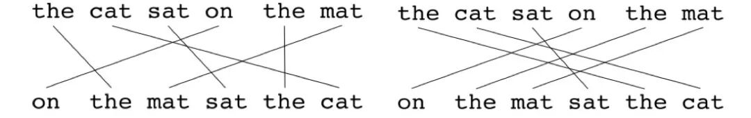 参考链接:机器翻译评测——BLEU改进后的NIST算法 .博客还详细介绍了如何使用nist去评测,感兴趣的同学可以看看。 4)METEOR 和BLEU不同,METEOR同时考虑了基于整个语料库上的准确率和召回率,而最终得出测度。 METEOR也包括其他指标没有发现一些其他功能,如同义词匹配 等。METEOR用 WordNet  等知识源扩充了一下同义词集,同时考虑了单词的词形(词干相同的词也认为是部分匹配的,也应该给予一定的奖励,比如说把 likes 翻译成了 like 总比翻译成别的乱七八糟的词要好吧?) 在评价句子流畅性的时候,用了 chunk 的概念 (候选译文和参考译文能够对齐的、空间排列上连续的单词形成一个 chunk,这个对齐算法 是一个有点复杂的启发式 beam serach),chunk 的数目越少意味着每个 chunk 的平均长度越长,也就是说候选译文和参考译文的语序越一致。最后,METEOR计算为对应最佳候选译文和参考译文之间的准确率和召回率的调和平均: 理解 看公式总是挺抽象的,下面我们还是看看来自维基百科的例子吧。计算的最基本单元是句子。算法 首先从待评价字符串和参考字符串之间创建一个平面图如下: