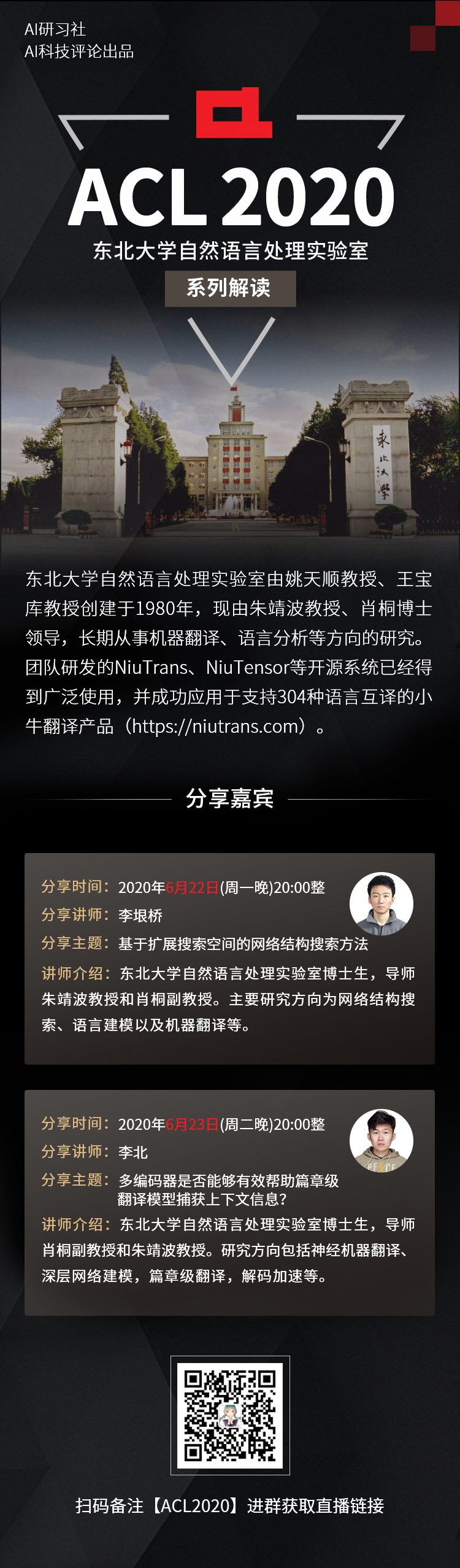 ACL 2020原定于2020年7月5日至10日在美国华盛顿西雅图举行,因新冠肺炎疫情改为线上会议。为促进学术交流,方便国内师生提早了解自然语言处理 (NLP )前沿研究,AI  科技评论将推出「ACL 实验室系列论文解读」内容,同时欢迎更多实验室参与分享,敬请期待! 点击"阅读原文",直达“ACL 交流小组”了解更多会议信息。