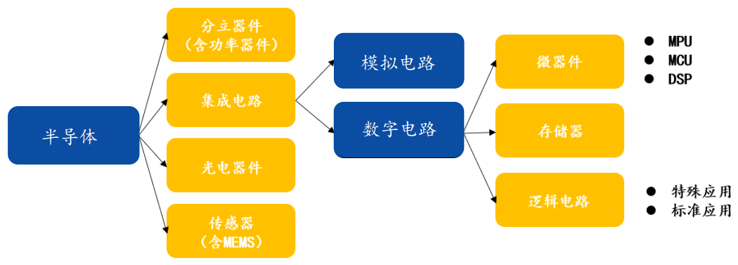 按类型分类,半导体芯片主要有集成电路、分立器件、传感器、光电子器件等四大类别,其中集成电路约4,100亿美元,占比84%。