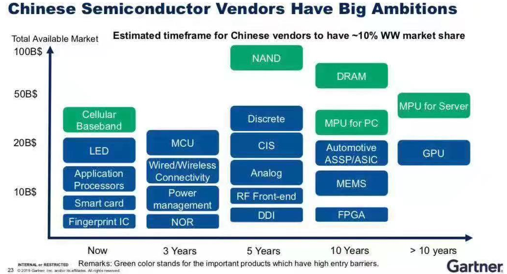 国际咨询机构Gartner对中国各芯片领域崛起时段进行评估,标准是占全球市场份额超过10%。