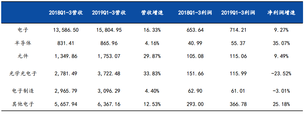 在中美贸易摩擦、高科技企业被美封锁的背景下,2019年电子行业在逆境中迅速发展,整体实现营收与利润的共同增长。以申万电子行业板块的上市公司为样本进行统计,2019年前三季度,电子行业上市公司总营收规模达到15840.63亿元,同比增长16.33%,实现净利润714.21亿,同比增长9.27%。而2019年前三季度,半导体行业上市公司总营收规模达到865.96亿元,同比增长4.16%,实现净利润40.99亿,同比增长35.07%,利润增长迅猛。