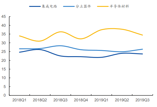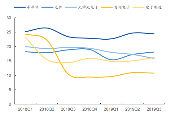 电子行业毛利率2019年前三季度继续稳定在23%至25%之间,该领域毛利率最高的是半导体,2019年行业的毛利率一直保持在35%以上,也说明了半导体作为基础行业在各自领域具有一定的护城河,集成电路细分行业的毛利率在半导体板块中处于最低的水平,稳定在23%左右。