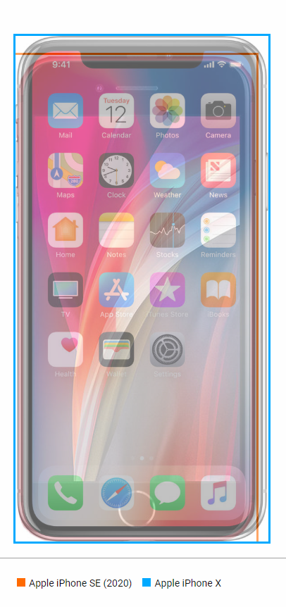 下面是iPhone SE(2020)与iPhone X的尺寸对比,我们会发现,虽然SE是4.7英寸屏幕,X是5.8英寸屏幕,但两个手机的尺寸非常接近,X只比SE大了一小圈而已。
