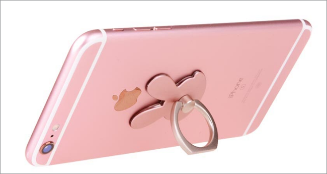 但把这部手机换成4.7英寸的iPhone 6或者5.5英寸的iPhone 6 Plus时,问题就变大了,你不可能通过一个固定的手部姿势来使用它们,必须大幅度调整它们俩在手里的位置,尤其是Plus系列,很多手小的女生,纷纷给手机加上了“外设”,比如下面这种指环式支架……