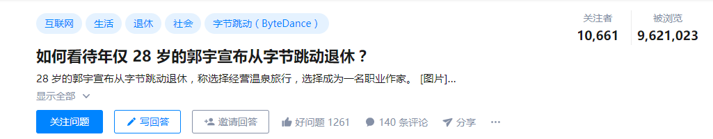 近日,知乎一篇名为“如何看待年仅28岁的郭宇宣布从字节跳动退休?”的帖子引发网友热议,话题已有近1000万浏览量: