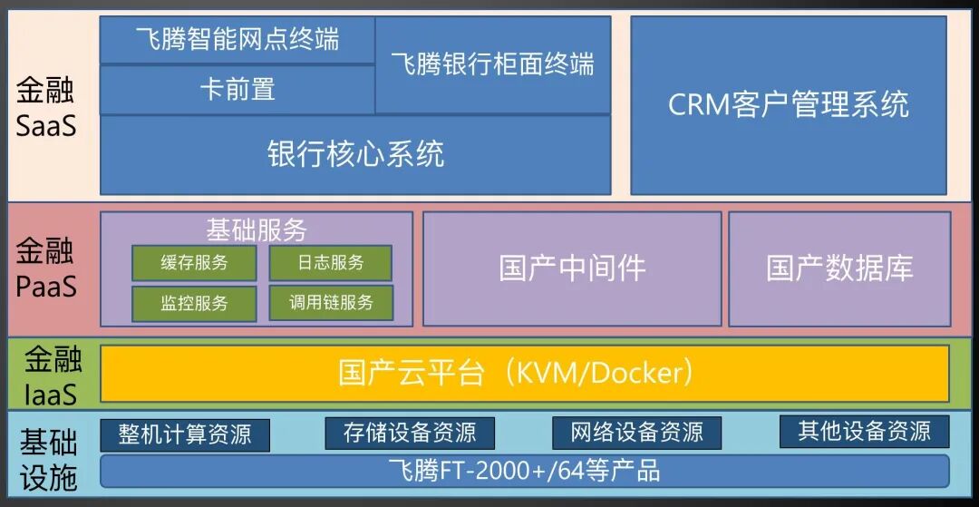在相对具体的实施层面,这里我们举几个例子。这张图是飞腾在金融行业的应用案例。这是基于飞腾FT-2000+的解决方案。旨在满足金融行业基础设施采购模型,提供金融基础设施服务,且与国产数据库组合,逐渐具备构建金融核心系统的能力。