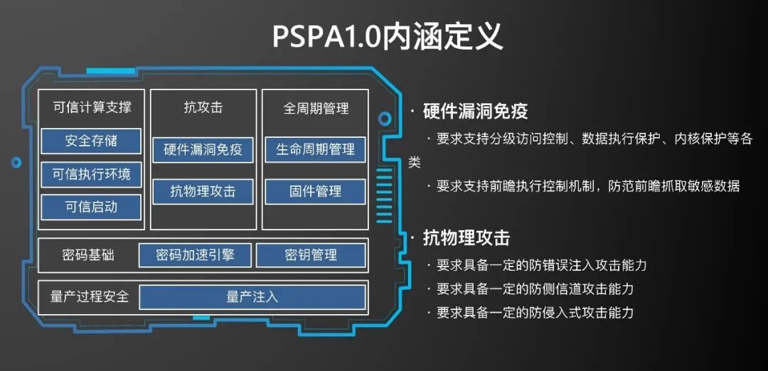 到制造流程,是否在某个环节被人在芯片上植入了后门。去年12月,飞腾生态合作伙伴大会上,飞腾发布了PSPA1.0标准,这是飞腾定义的处理器安全架构标准——这是国内首个