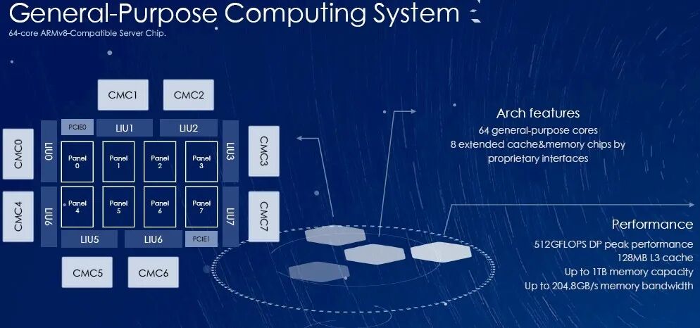 ),支持2-8路直连(即单个计算机系统支持最多8颗处理器),而且有64MB L3 Cache——这一点相比FT2000+/64应该算是个重要提升,8个