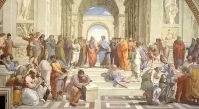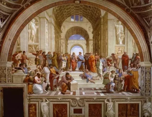 之后文艺复兴时期,著名的画家拉斐尔为罗马教皇创作壁画,绘制了《雅典学园》。