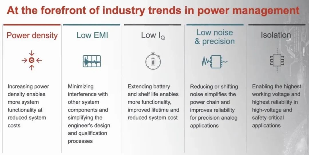 Gary表示,从几年前开始他就一直在观察电源行业的前沿趋势,对于德州仪器来说,这五项指标是关乎一个公司能否在电源行业处于领导地位。