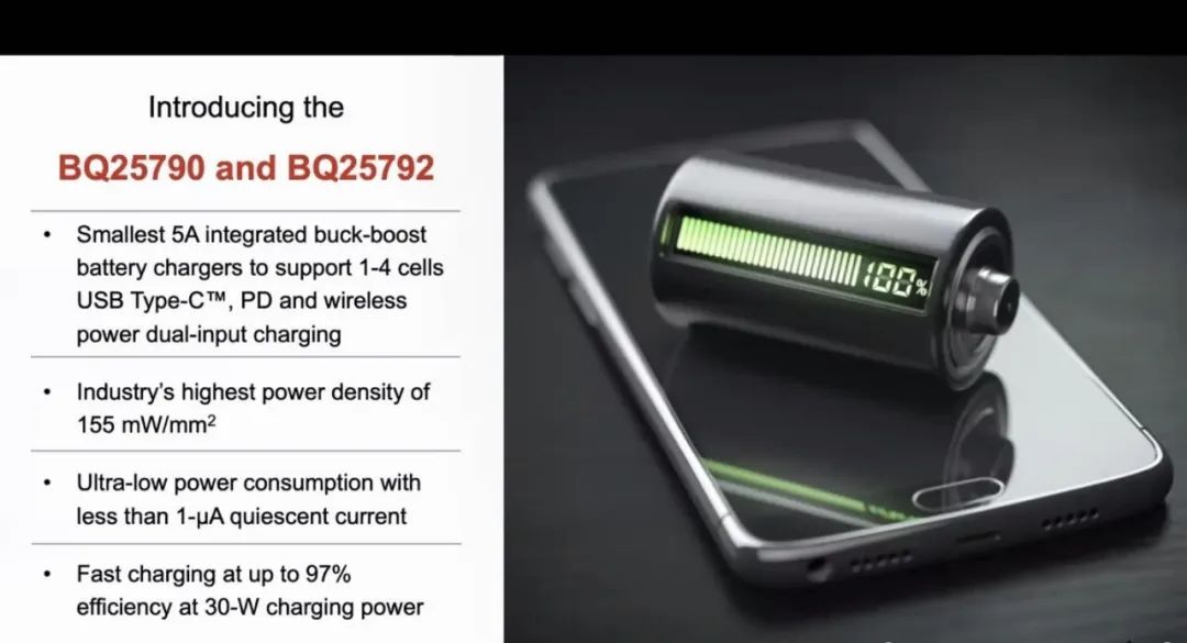 Samuel介绍了德州仪器新发布的升降压的充电器BQ25790和BQ25792,可以支持5A充电1到4节的充电电池,可以适配USB,同时可以支持无线充电输入。它将传统的5W到10W的输入端口提升到了100W,可以给更多种的应用来提供更大的功率进行充电,可以工作在降压模式、降压模式或者升降压模式。