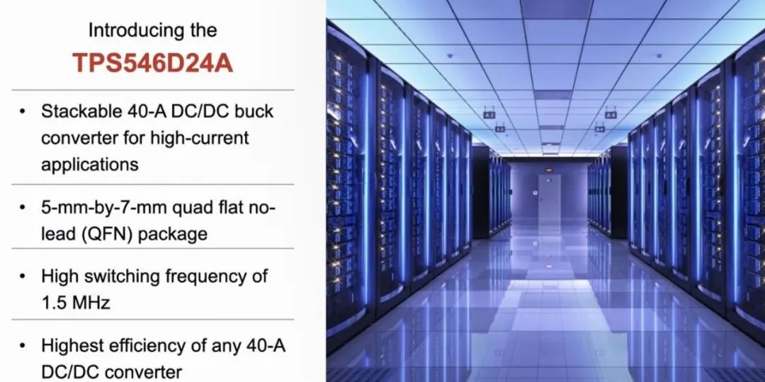 Gary介绍到,这款新产品TPS546D24A的亮点是它本身可以堆叠,单颗产品可以支持40A的电流,当堆叠最多4颗时可以支持最高160A的电流,高于其余竞争对手。新产品本身的尺寸非常小,同时这款产品开关频率高达1.5MHz,提高了产品本身的效率。这款产品除了能实现减少更多的外部元件,热损耗相比于其余市面上产品低13度,同时这产品拥有非常小的导通电阻,所以在整体设计上能够比竞争的DC/DC转换器高3.5%的效率。此外,还满足严格的电压精度要求,提供输出电压误差小于1%和针带可配置性。