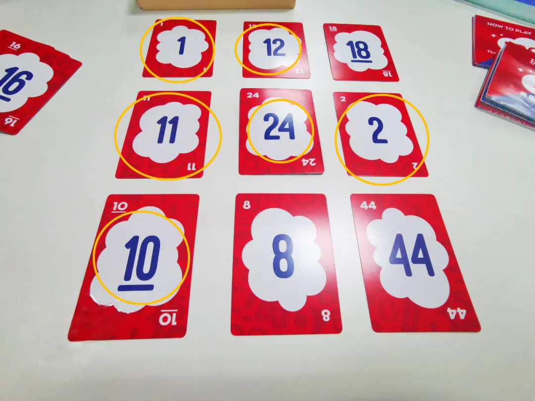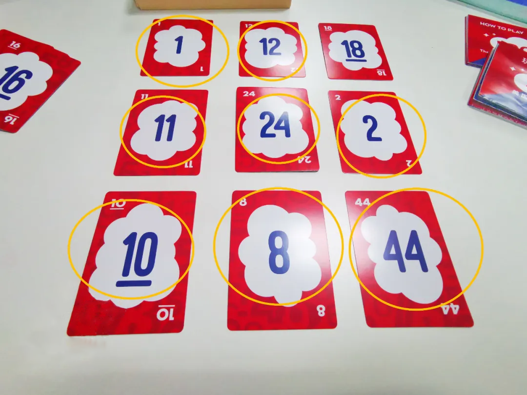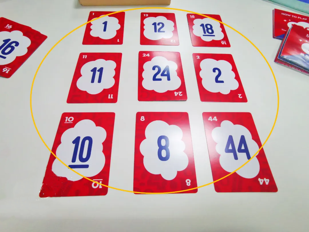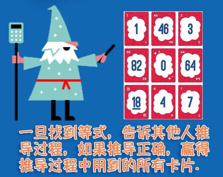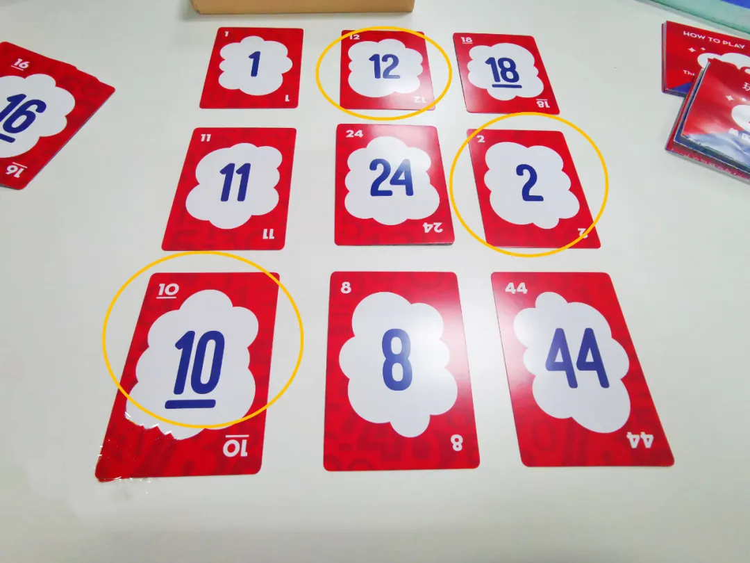 在一个回合中,如果有玩家率先发现了等式并喊出了结果,那么其他玩家就不能喊了。△ 比如,1+11=2+10=12,12不在9张牌中,但是参与运算的数字,1、2、10、11必须是在卡牌中的。