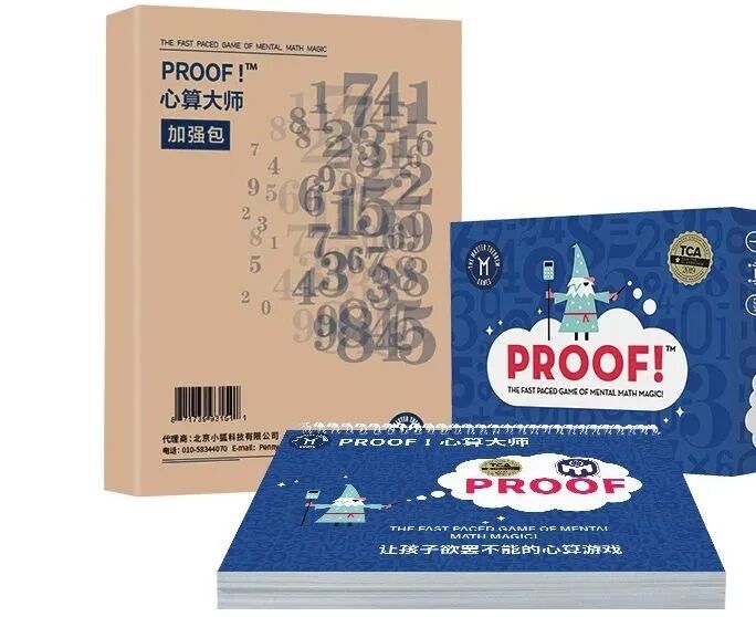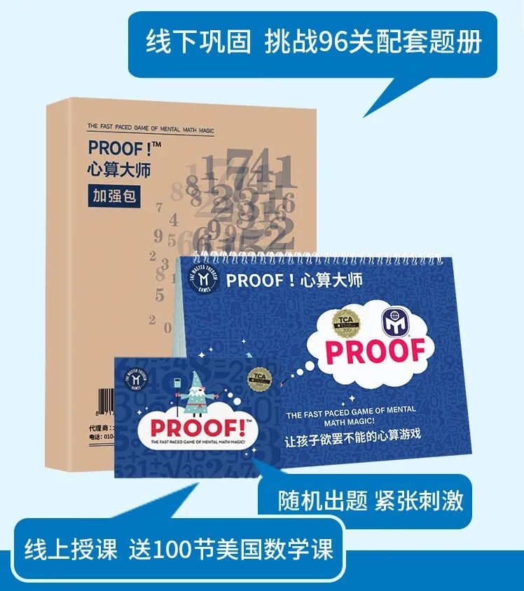我们经常听到类似于:XX做事乱七八糟,没有计划性,不懂如何规划。那到底什么才是规划能力?日本作家斋藤孝在他的《规划力:如何清晰预见成功轨迹》一书中,就提出规划力,是把事情分出先后主次再适当地使用能量的方法。上面这类几何题目,其实就是在考验规划能力、图形的视觉分割能力以及专注力。大部分家长对数学启蒙往往有一个误区:一味追求孩子能数到几,能做100以内的加减法了吗?能背乘法口诀了吗?而忽略了数学是一个庞大的学科,计算只是其中的一部分能力而已。其实,孩子4岁后就开始对数字、图形产生越来越浓厚的兴趣,日常生活中的事物来进行几何启蒙,也是在激发他们学习数学的兴趣。而规划能力结合了思考能力、决策能力、应变能力以及协调能力,是一种综合能力。规划能力很重要的另一个原因是,它是孩子上学后学习的基础,多个学科如何进行学习、复习、预习,都是规划能力的体现。孩子在玩耍中学会通过对游戏全局的准确分析、合理规划、并充分发挥每块玩具的优势,最后才能取得胜利。先思考、后分析,然后在重要的部位使劲,结局自然不会太差。规划不是按部就班,而是找到关键。而专注力的误区就更大了,总以为这种能力就是孩子可以坐的定,可以听完一本书。其实这只是很小一部分,专注力很关键的是可以多持久地进行解决问题,这才是高阶专注力,毕竟这才是我们孩子接下来会经常遇到的情况。我们一直把桌游称为“比聪明玩具更加聪明”,一大原因就是,它的挑战更加定向,对孩子专注力和解决问题能力更明确。今天推荐的这套专为5-12岁孩子设计,美国学校指定教具《PROOF!》美国数学心算大师桌游,不仅完美契合了教育部《全日制义务教育数学课程标准》和《小学数学教学大纲》对计算能力的要求,还让孩子在理解运算规则的基础上,通过趣味游戏,提升运算的准确性和运算速度,培养他们对数字的敏感度。而游戏规则看似增加了难度,其实是在拉长孩子专注力,及时反馈帮助孩子不断挑战。引进中文版时,还为它开发了专属的96关题册(加强包)和配套的100节课程,更有针对性和有效地帮助国内孩子提升数感和运算能力。