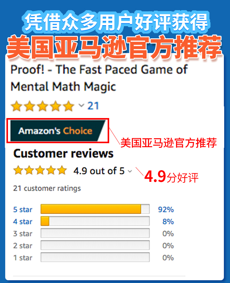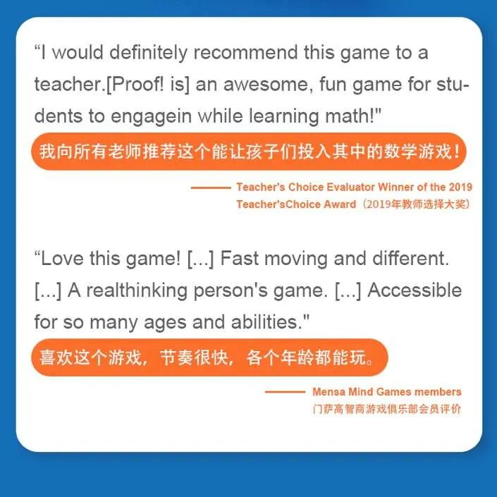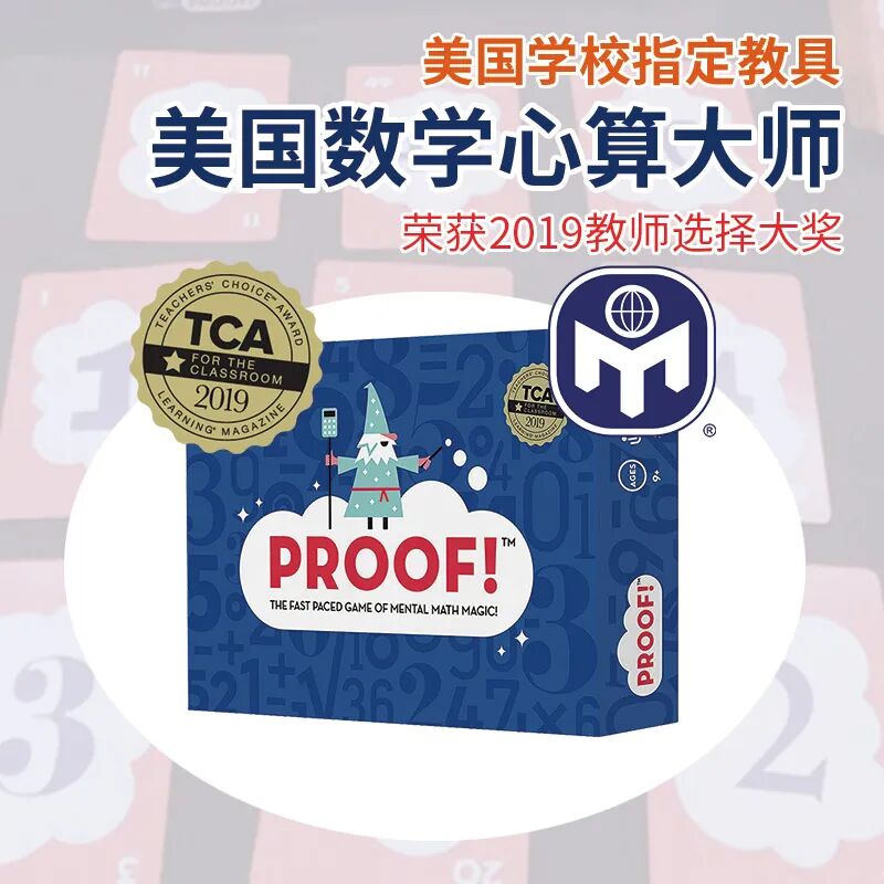 它的设计者是美国麻省理工学院(MIT)研究员肖恩·扎尔茨贝格,依据美国教学大纲(CCSS)研发。表面看这套教具由100张数字卡牌组成,非常简单。但是这些数字并不是1到100,而是由MIT基于大数据模型计算、科学筛选出来的最适合、也最能有效训练数感和运算能力的数字组合。这套教具一推出就被美国很多天才班(Gifted and Talented)和数学拔尖班的老师看中了,拿来作为学生的课堂教具, 成为了美国很多学校指定的教具。《PROOF!》心算大师虽然功能强大,但规则很简明,非常容易上手,分成4个步骤:寻找等式、喊出结果、证明等式、积累卡牌(后面细说~)。· 提升决策能力和心理素质。一般来说,简单的等式需要的思考时间比较短(最少3张),但是能够得到的卡牌数量也少,而复杂的等式耗时更长,收获的卡牌也更多(一次拿到9张也是有可能的!)。所以,这就需要孩子在竞赛中,根据牌型、对手状态、卡牌差距选择最佳的解题答案和时机,决策力和心理素质会得到充分且有效的锻炼。· 培养多角度思考方式。每一局的数字组合都是随机的,答案也不止一个。在游戏中,孩子不光要自己想答案,同时还要验证对手的答案,通过这样的规则设定,可以让孩子了解别人的思考过程和解题方式,促使自己不断“迭代”思维方式,优化解题思路。因为它的出色,《PROOF!》心算大师荣获了2019教师选择大奖,并获得了高智商俱乐部门萨的成员推荐!孩子使用教具的过程,其实和平时玩桌游的感觉很像,在游戏感十足的环境中,进行一次次高强度的运算竞赛,对数字更敏感了,反应速度、运算准确率提升效果也是杠杠的。