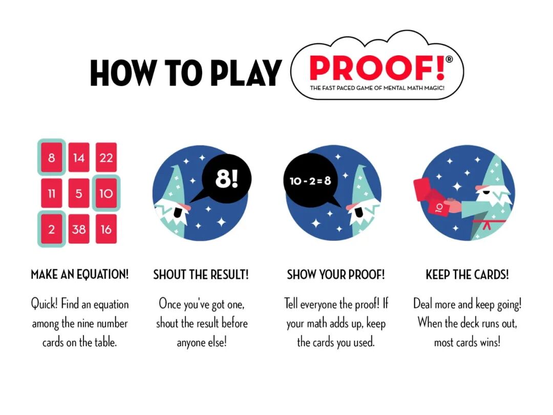 当一个人喊出结果后,其他人要去验算,检查这个等式是正确的(PROOF!这个名字就是由此而来的)。- 若等式正确,那么喊出答案的玩家,可以赢走参与运算的所有卡牌。