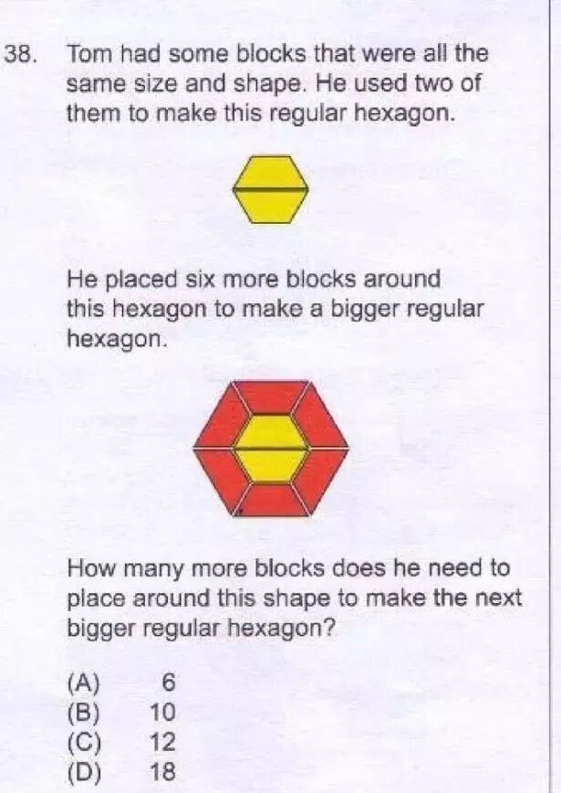 澳洲著名的教育评测研究机构ICAS,曾出过这样一道题:有一些同样大小和形状的积木。用其中的两片可以组成这个正六边形,这时再用六片积木在六边形的周围组成更大的正六边形。如果还要做一个更大的正六边形,需要在现在的六边形周围再放多少片积木?