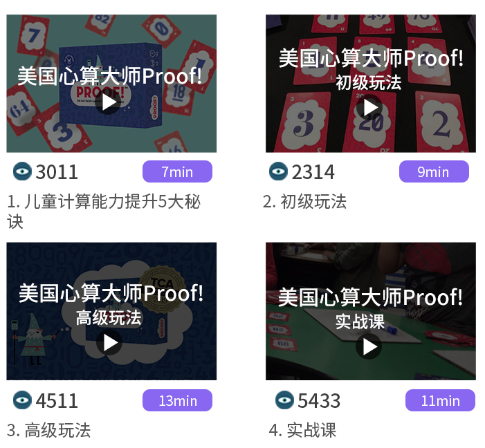 由易到难,通过有梯度的练习,孩子循序渐进,逐渐掌握各种运算技巧,思维还能得到充分的训练。除了手册外,每套《PROOF!》心算大师还赠送了100讲解课程(未全部上线,逐步更新中),从初级玩法和实战案例开始,再逐渐到高级的复杂的玩法,也是一个循序渐进的学习过程。课程需要扫描二维码绑定小程序以后查看,小程序二维码在和卡牌放在了一起。《PROOF!》心算大师原价109,团购只要79;含加强题册的原价是148,团购只要109~