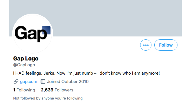 设计师阿明·维特(Armin Vit)指出:“这个新的Logo令人非常尴尬,实在是不知道公司和设计师是怎么作出这个决定的。”Typekit的创意总监杰森·圣玛丽亚(Jason Santa Maria)这样评价:“任何一个设计师,尤其是Logo的设计师,都不会允许他们设计的内容走下坡路。”设计师斯科特·麦凯恩(Scott McKain)则说:“这真的很尴尬,让我想起了我刚刚开始自己的设计事业时,设计过一个类似的Logo,我当时以10美元的价格卖给了一个名片公司。”不知道GAP的管理层听到之后会怎么想。如果他们的新Logo也值十美元,那可能也不亏。紧接着GAP还做了一个更糟糕的事:它开了一个网页,允许所有用户制作自己的Gap Logo。最后这个网页中有将近14000个相关作品,很多人都无偿为他们设计Logo。有人甚至恶搞地开通了一个推特账户,用拟人的手法模仿GAP Logo的语气说:“我现在感到麻木,现在不知道自己是谁了”。GAP的Logo像是一个南瓜,人人都可以动手雕刻。非官方的推特账户|图片来自Medium